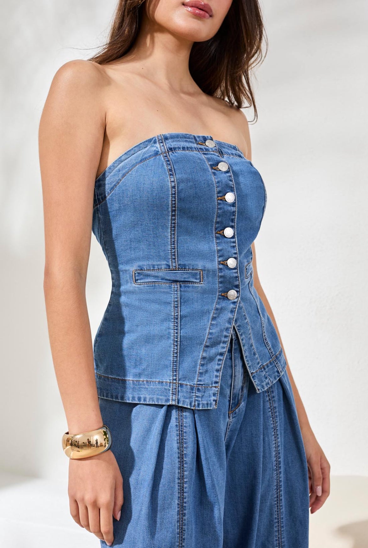 Reimagine denim dressing with this button front denim bustier top, expertly tailored for a structured silhouette and flattering fit. Premium stretch denim ensures comfort and flexibility, making this piece a standout option for layering or wearing solo in any modern wardrobe.
