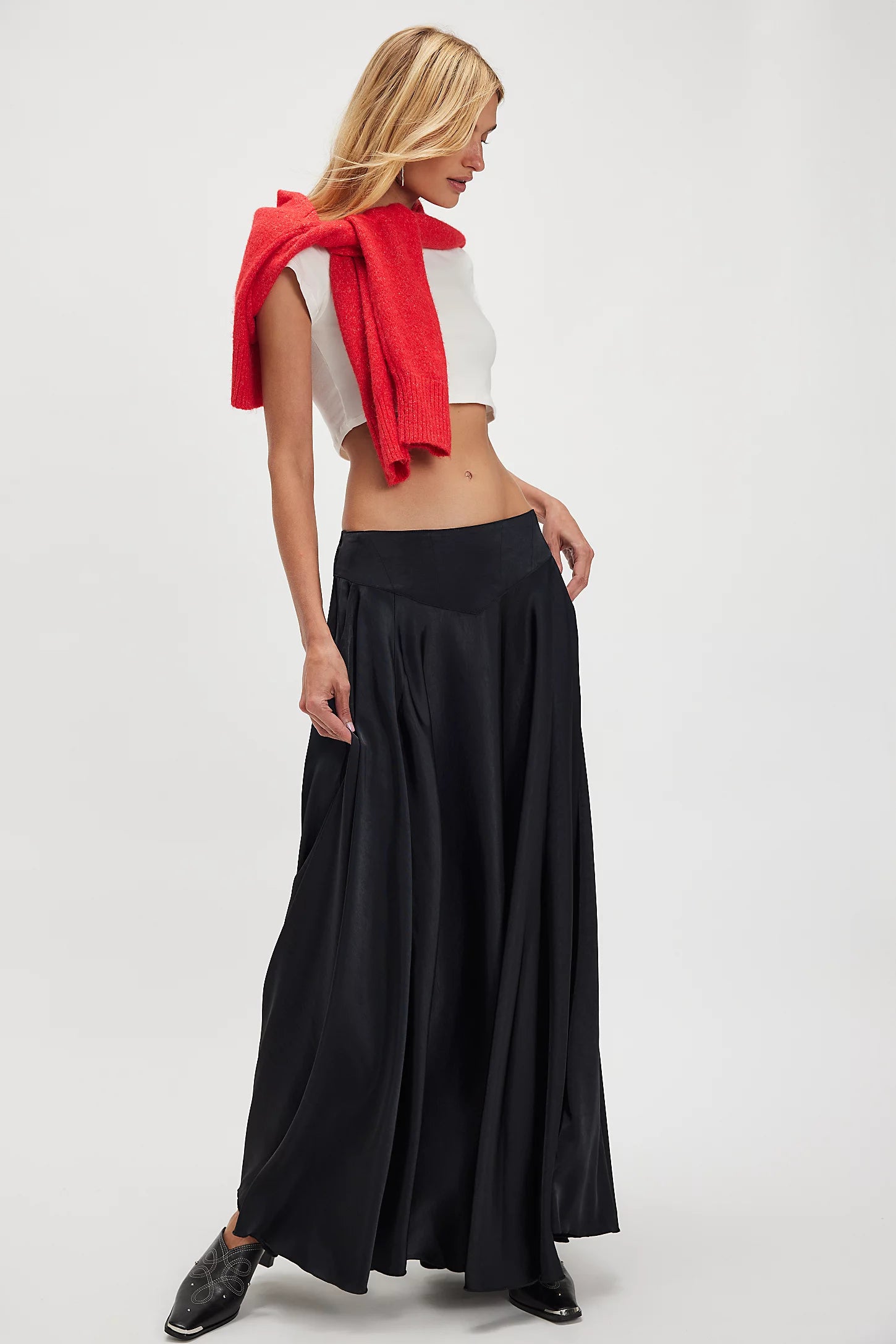 Stunning is an understatement for this satin maxi skirt, featured in a cascading A-line design with a pointed waistband for an extra elevated detail.